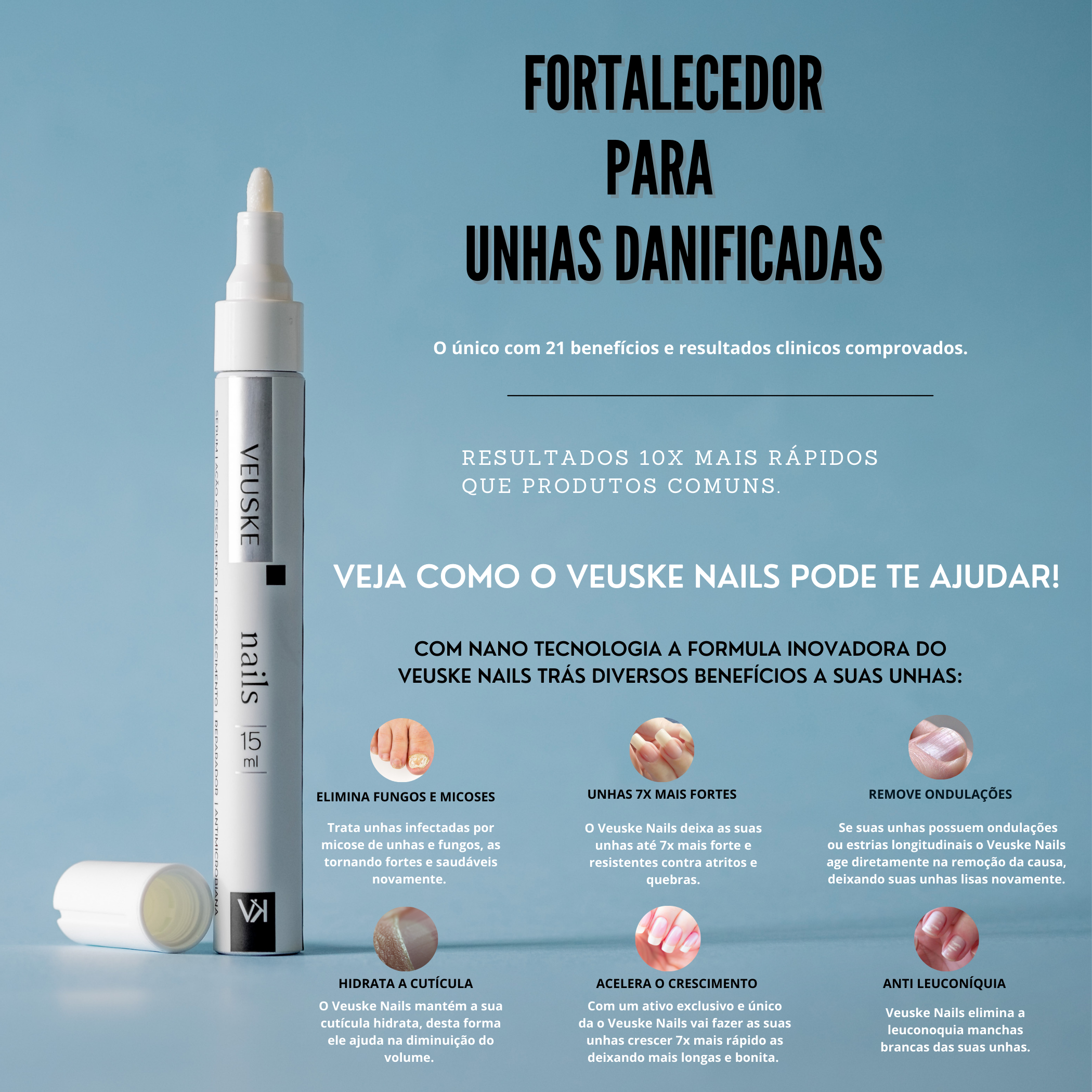 O VEUSKE NAILS é um Sérum de ativos encapsulados de nano partículas de alta permeação com eficácia clinica comprovada na reparação de unhas danificadas, com aspecto opaco, esbranquiçada, quebradiça, que não crescem.
