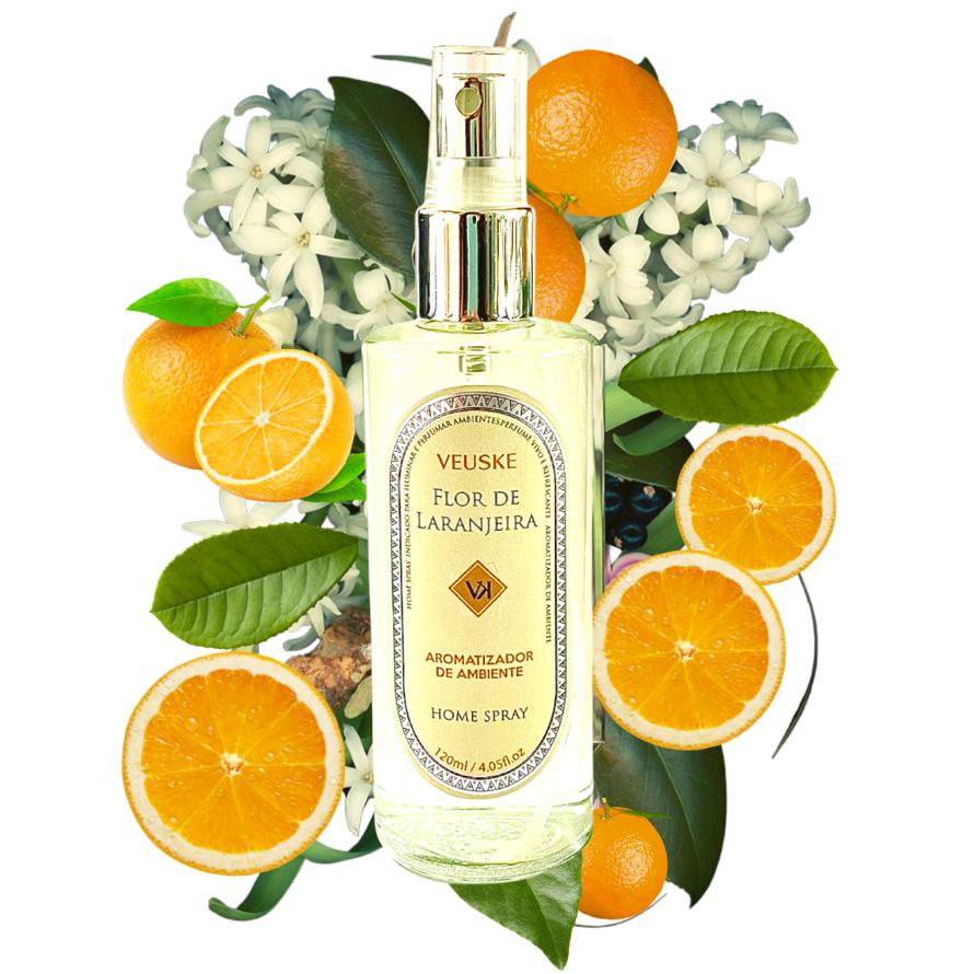 A linha Flor de Laranjeira da Veuske é totalmente impar, in natura, pura, realista, envolvente e radiante. Transmite a felicidade e a leveza de estar em um pomar úmido, num dia ensolarado, numa manha de primavera. As laranjas são realistas, exageradamente suculentas. reproduzem o cheiro in natura da planta.