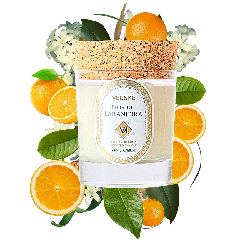 A Vela Aromática Flor de Laranjeira da Veuske é totalmente impar, in natura, pura, realista, envolvente e radiante. Transmite a felicidade e a leveza de estar em um pomar úmido, num dia ensolarado, numa manha de primavera. As laranjas são realistas, exageradamente suculentas. reproduzem o cheiro in natura da planta.